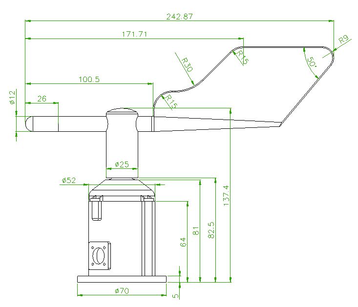 采用法兰安装方法,螺纹法兰连接使风向传感器下部管件牢牢固定在法兰盘上,底盘Φ70mm,在Φ61mm的圆周上开四个均Φ5mm的安装孔,使用螺栓将其紧紧固定在支架上,使整套仪器保持在最佳水平度,确保风向数据的准确性,法兰连接使用方便,能够承受较大的压力。