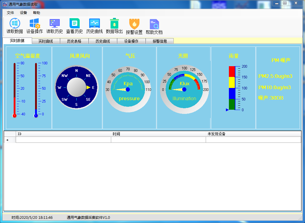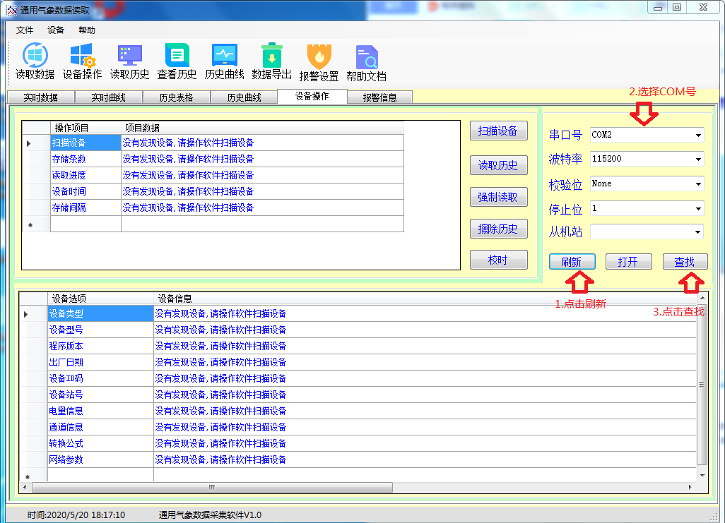 点击右侧的刷新,在串口号后面选择刚才查看到的COM口号,点击查找,此时软件会识别到设备信息,并在左侧显示出来。①读取数据,可以观察到传感器的实时数据。②读取历史数据:点击读取历史可读取历史数据